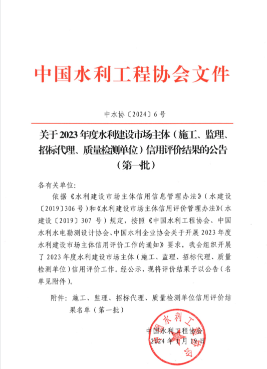 近日,中國水利工程協(xié)會《關(guān)于2023年度水利建設(shè)市場主體(施工、監(jiān)理、招標代理、質(zhì)量檢測單位)信用評價結(jié)果的公告(第一批)》(中水協(xié)〔2024〕6號)、中國水利水電勘測設(shè)計協(xié)會《關(guān)于2023年度水利建設(shè)市場主體(勘察、設(shè)計、咨詢單位)信用評價結(jié)果的公告》(中水協(xié)秘〔2024〕6號)、《關(guān)于2023年度全國水利水電勘測設(shè)計行業(yè)信用評價結(jié)果的公告》(中水協(xié)秘〔2024〕7號)發(fā)布。